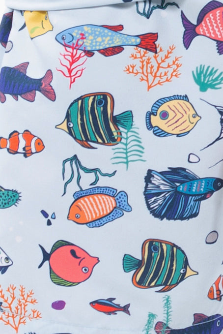 ¡Diversión bajo el sol con estilo! Esta bermuda de baño para niño luce un colorido estampado de peces que le dará un toque fresco y aventurero a sus días en la playa o la piscina. Confeccionada en tela de secado rápido y con ajuste cómodo, es perfecta para jugar, nadar y disfrutar sin límites.