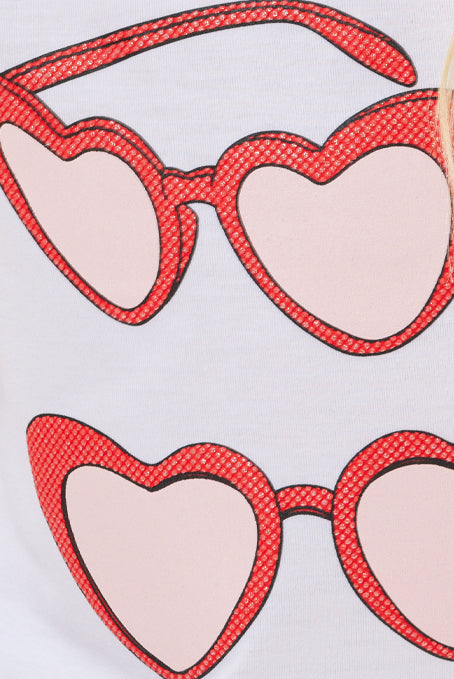 • Una camiseta con estampado de gafas en forma de corazón y detalles en relieve con glitter.