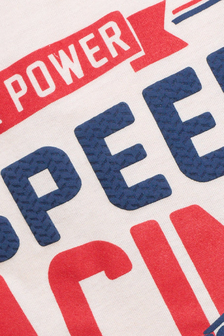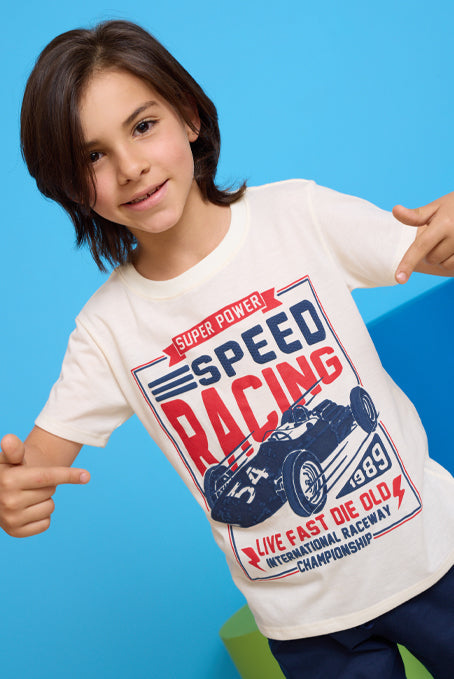 • Camiseta Blanca con estampado de auto de carreras y detalles de relieve en puff.