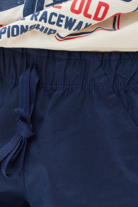 • Jogger azul navy de drill con cintura elástica ajustable, bolsillos y elástico en la bota.