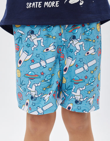 - Bermuda azul sublimada con astronautas, planetas y cohetes.